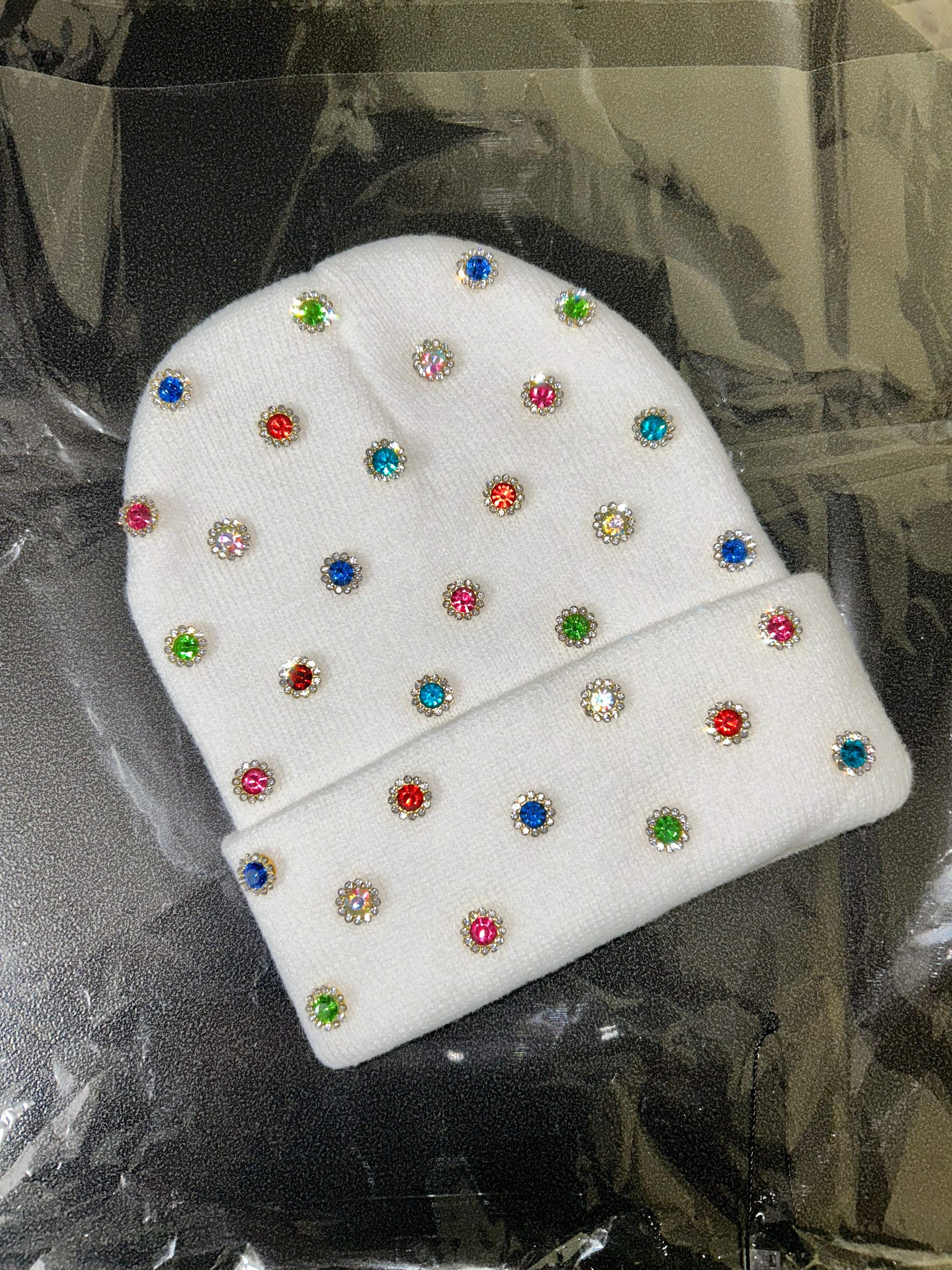 Designed with a clean white base and accented with vibrant rhinestones, this beanie delivers an icy look with a sweet twist. It’s bold yet effortless — made for those who like their style playful but intentional.