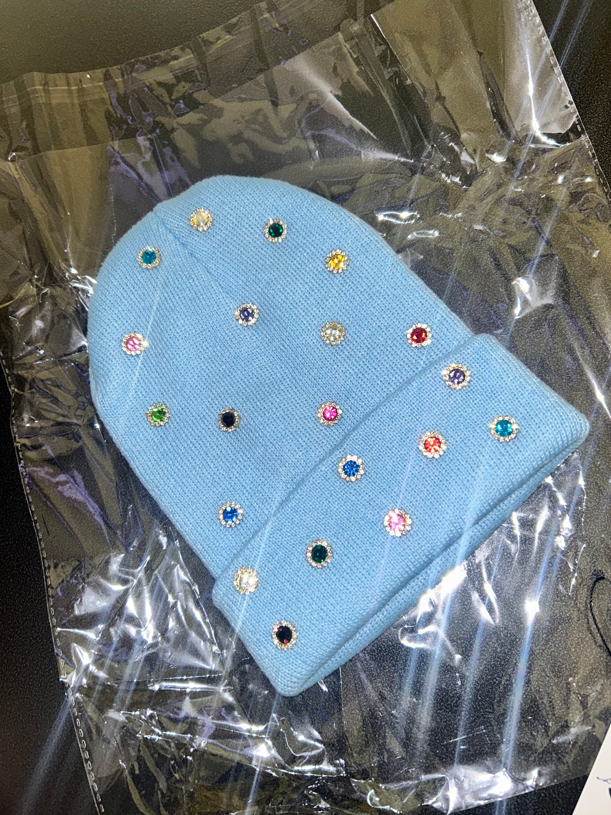 A soft blue knit beanie decked out in vibrant, multi-color rhinestones that catch the light from every angle. Cosmic Candy – Berry Blast brings a playful, luxe pop to winter style. Cozy, comfortable, and designed to stand out effortlessly. Perfect for anyone who loves bold color, unique details, and statement accessories that elevate any fit.