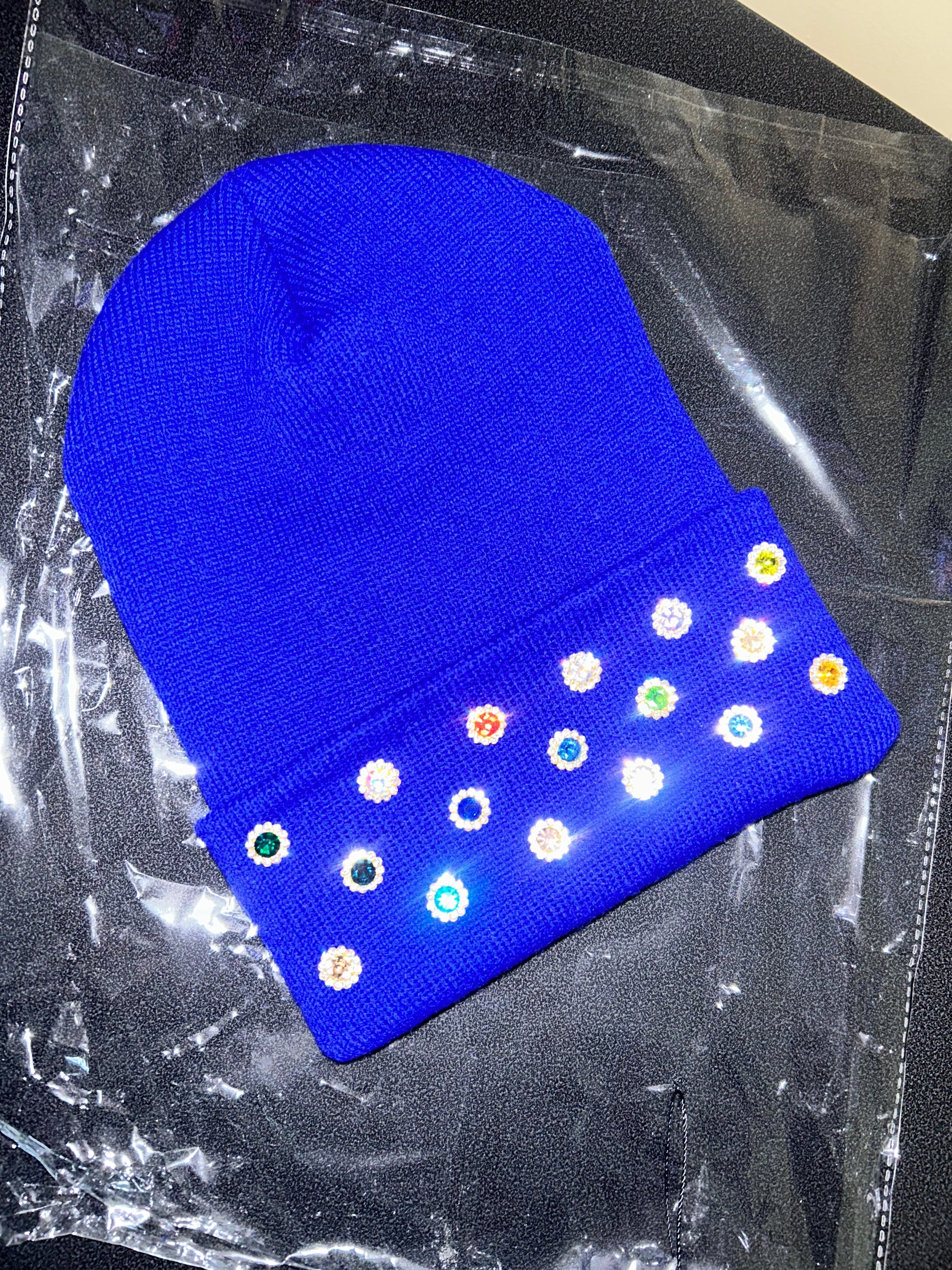Step into the galaxy with Blue Nebula, a bold royal-blue beanie sprinkled with multicolored rhinestones across the front cuff only for a clean, intentional pop. Each gem shines like a tiny star, creating a cosmic burst of color against the electric blue base.
