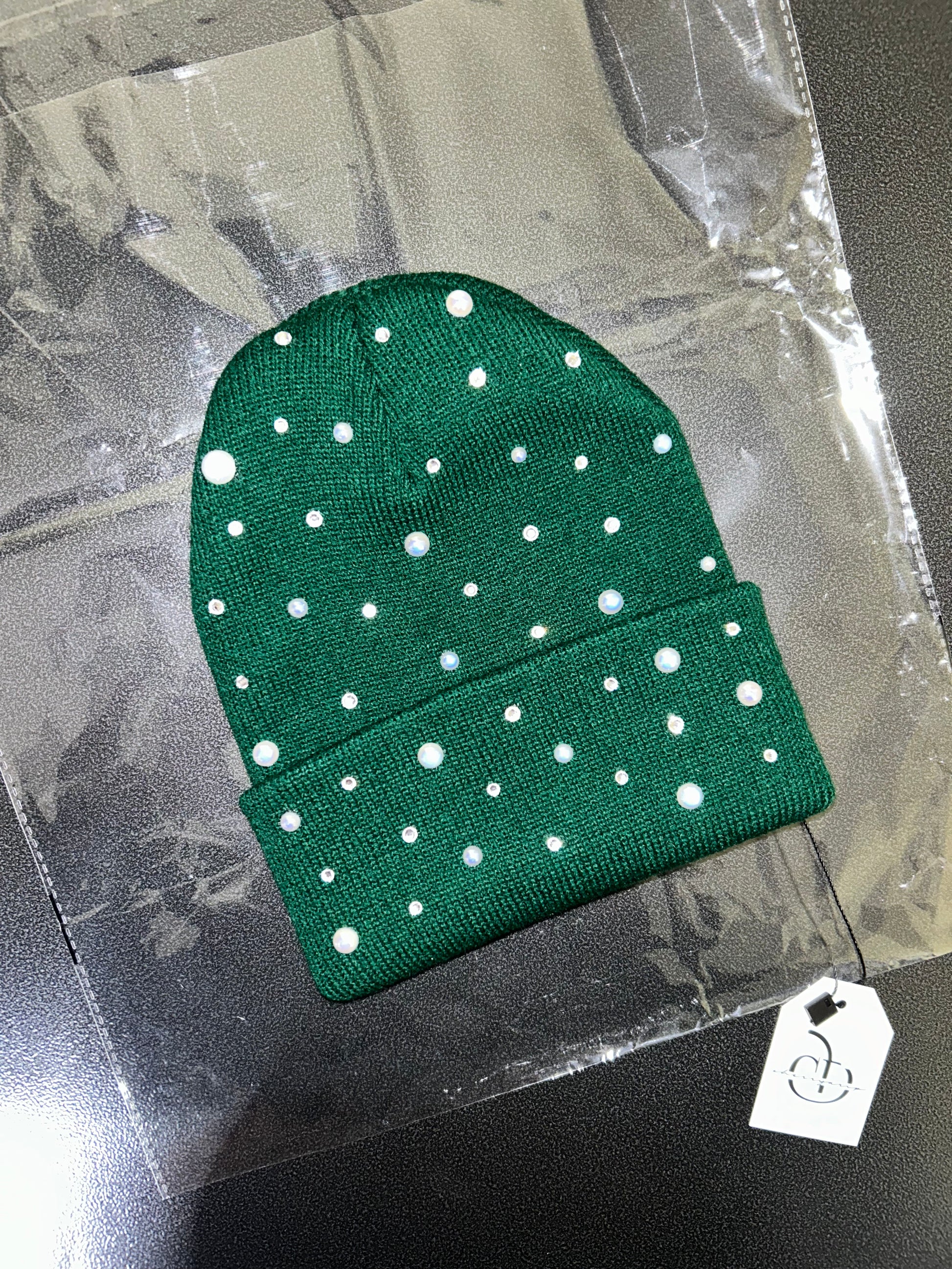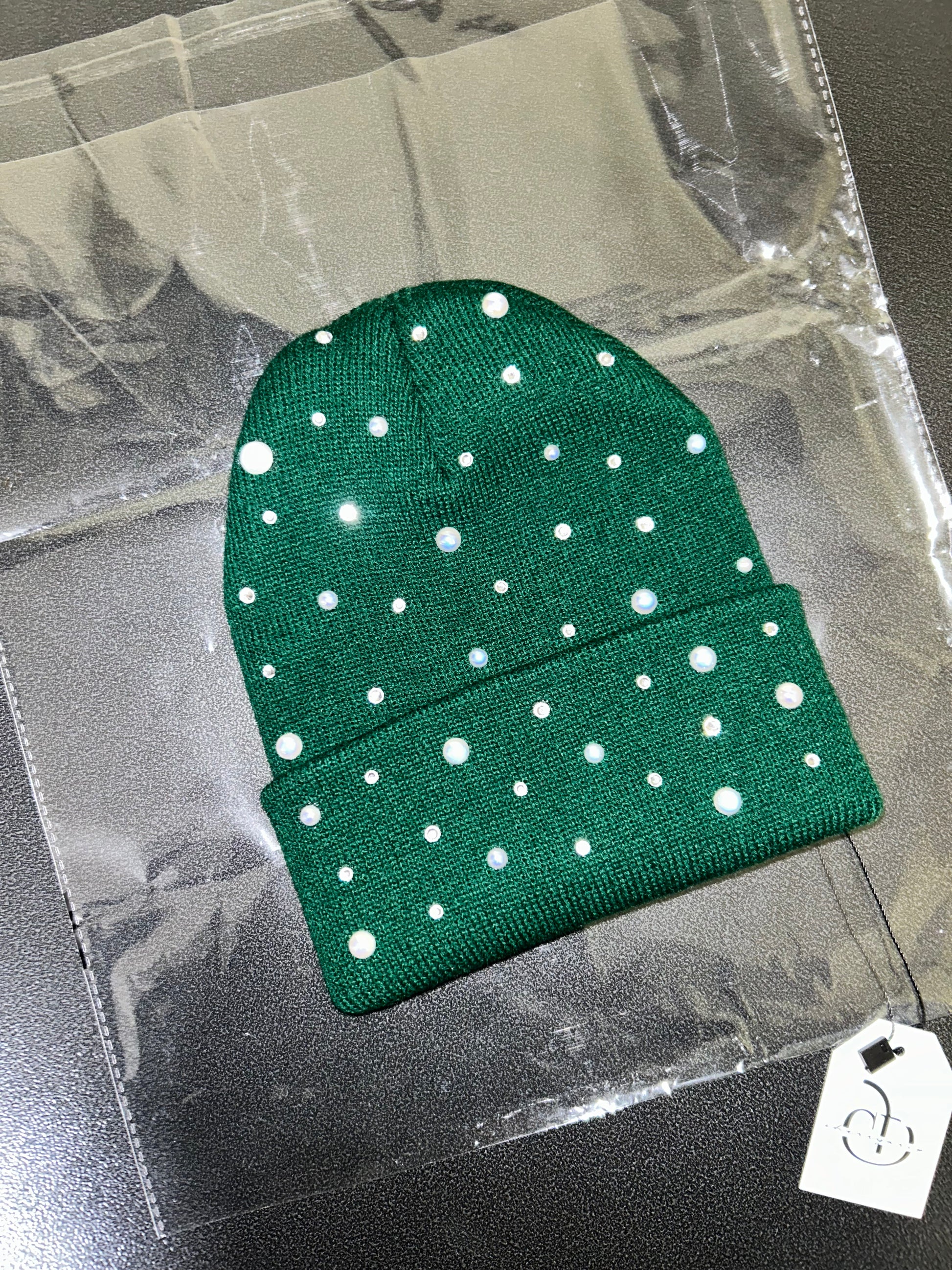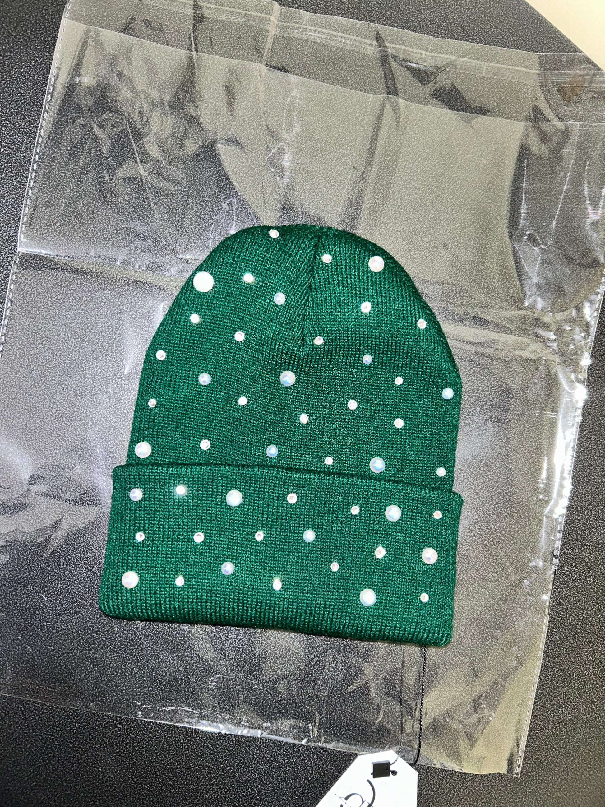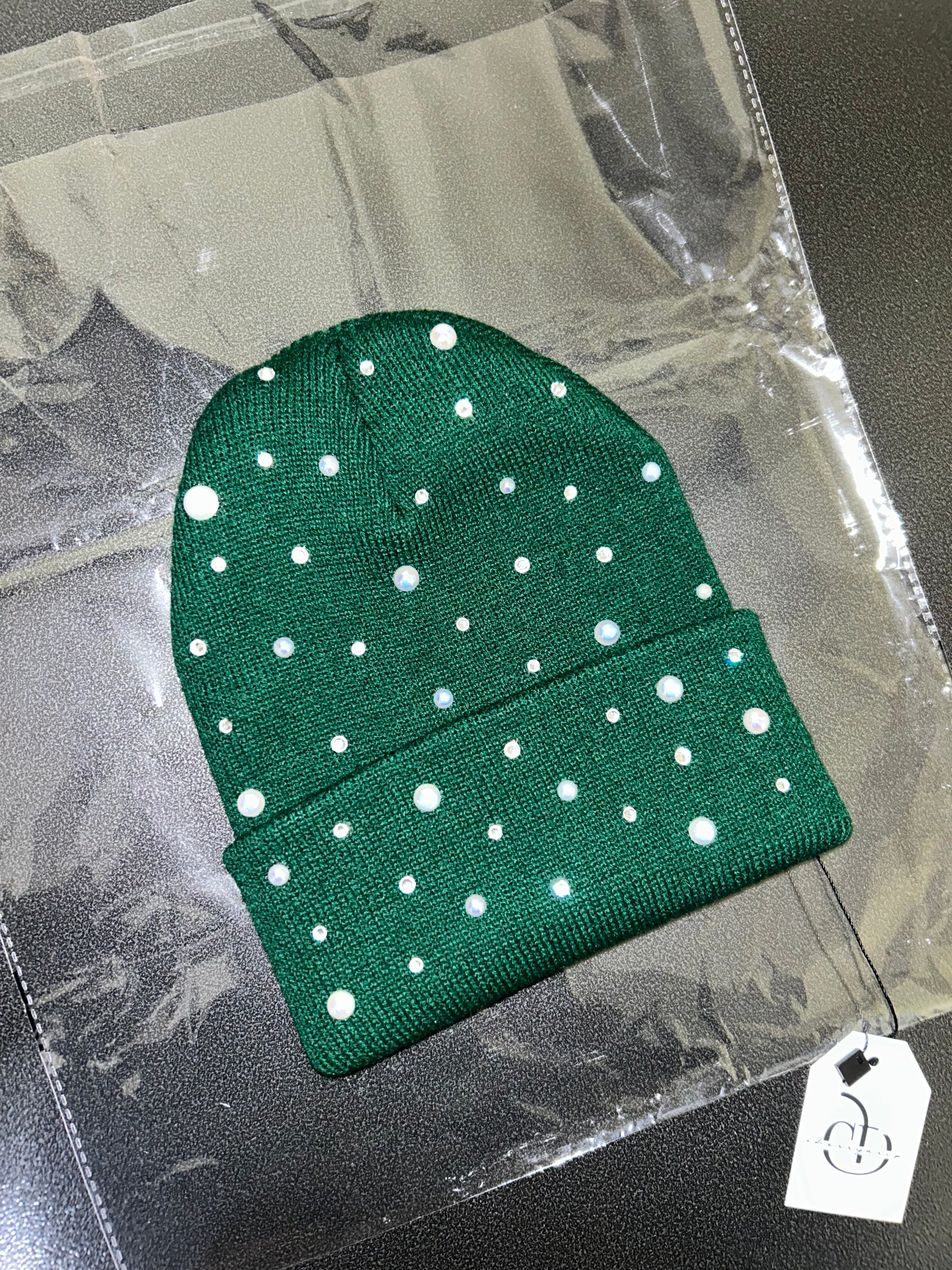Shine effortlessly with the Emerald Glow Beanie. This rich emerald green knit is beautifully detailed with a mix of beige AB pearls and sparkling rhinestones that reflect light with every movement. The scattered embellishments create a soft, glowing effect that adds a touch of elegance and shine to a classic streetwear staple.