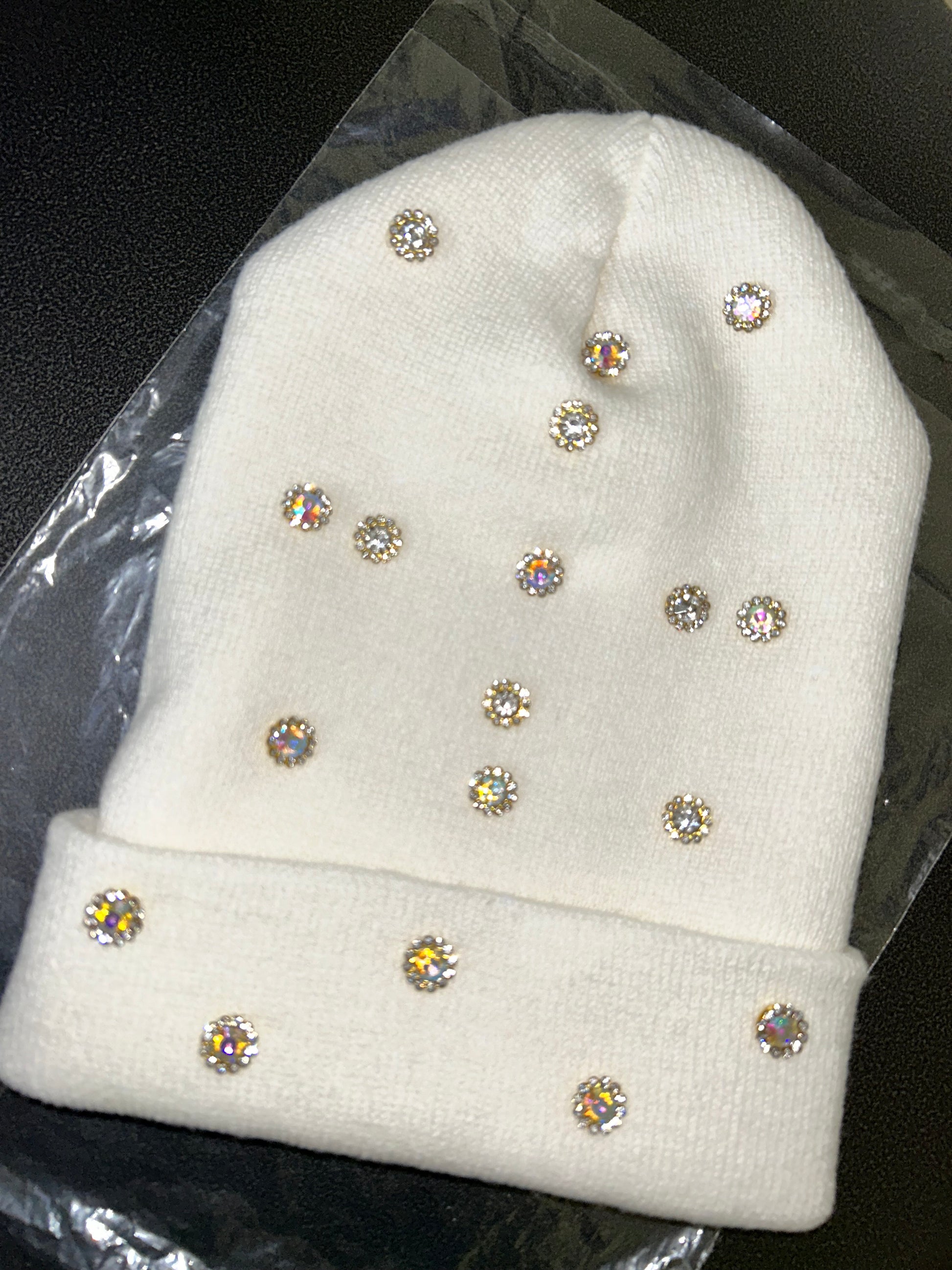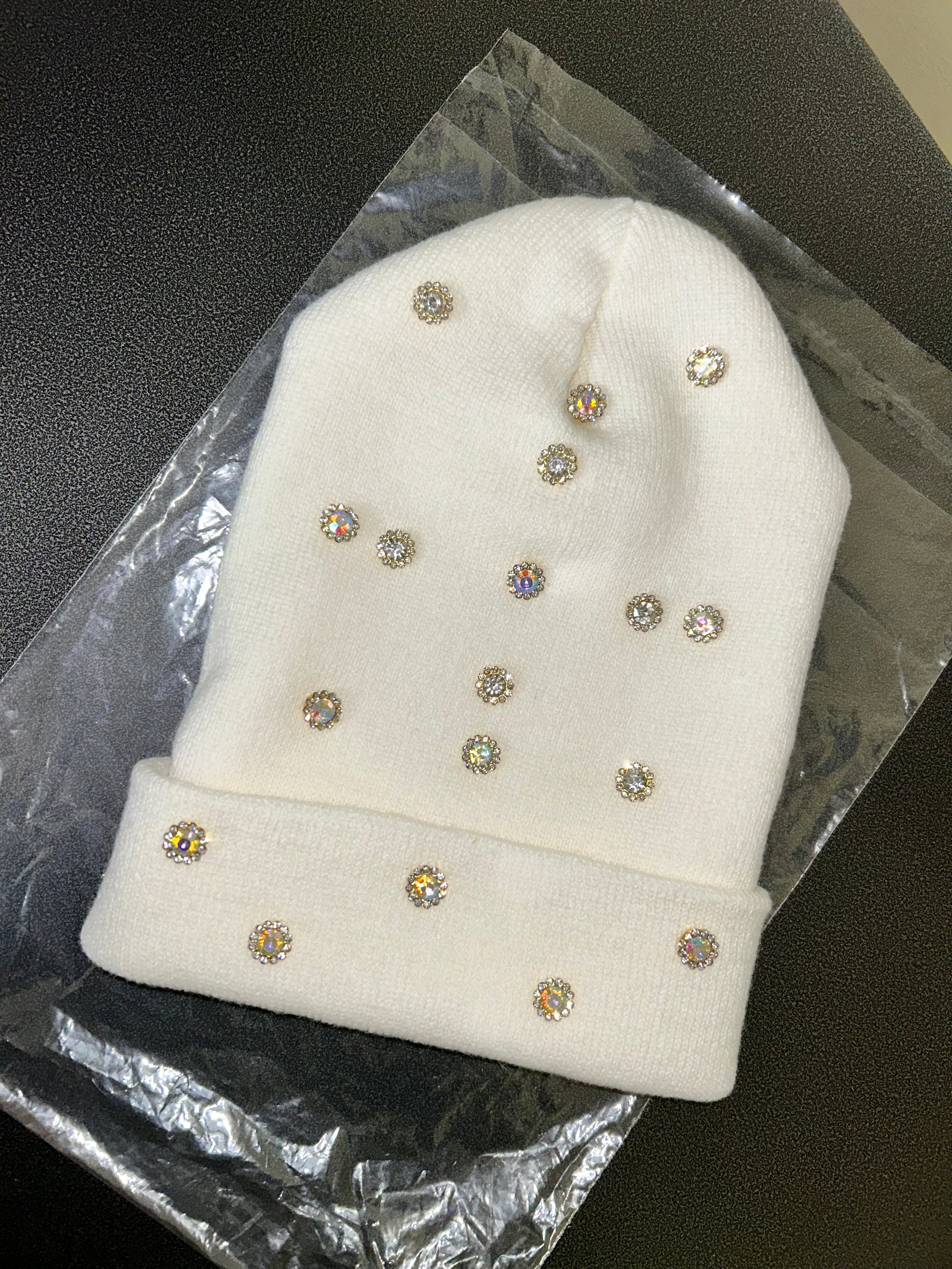The Ice Angel beanie transforms a pure white cuffed knit into a frosted masterpiece. Hand-decorated with AB rhinestones and clear crystals, it shimmers like frozen light — shifting colors with every movement. Soft, ethereal, and dangerously pretty, this piece carries quiet power with a glow that feels almost unreal.
