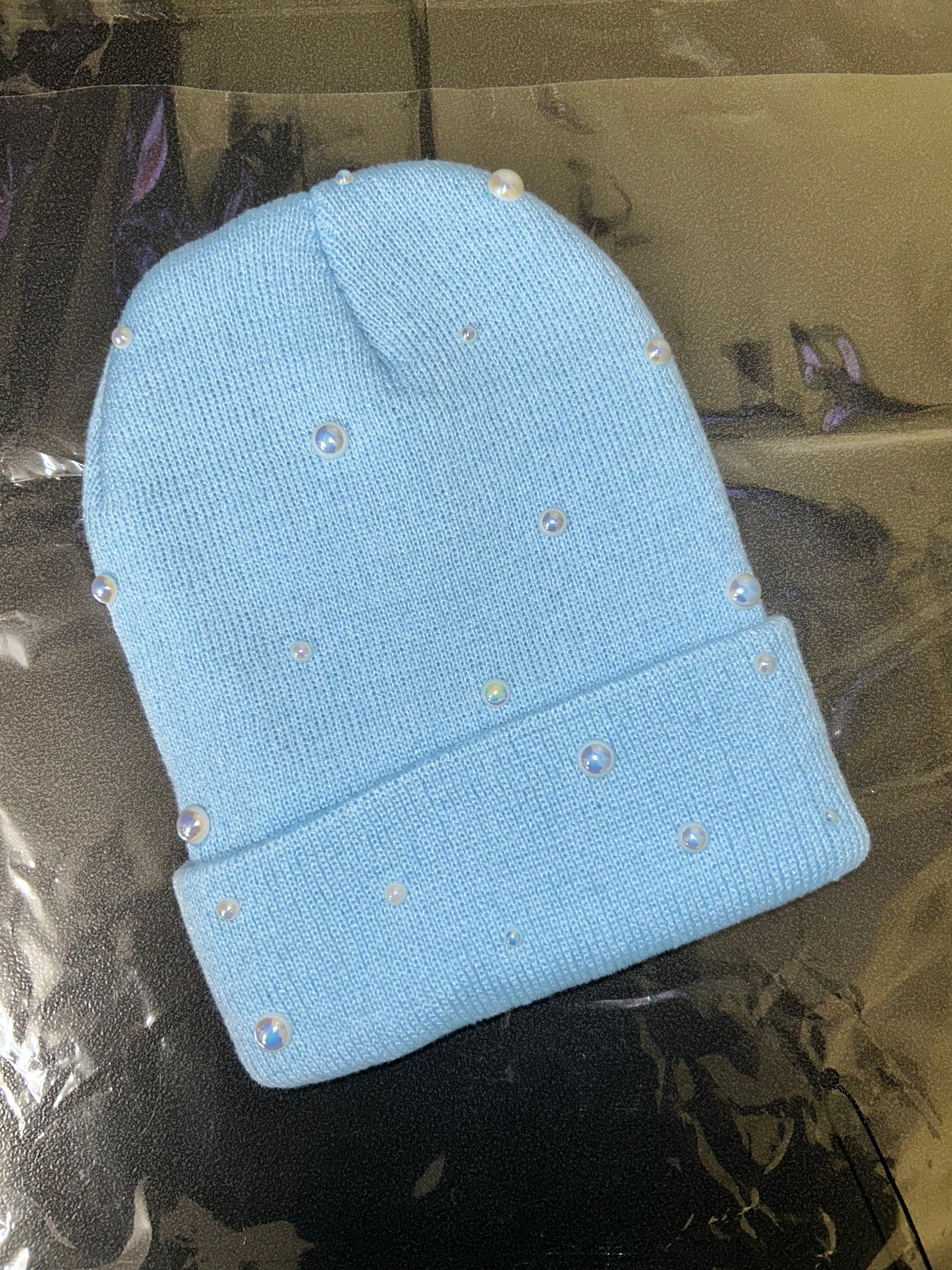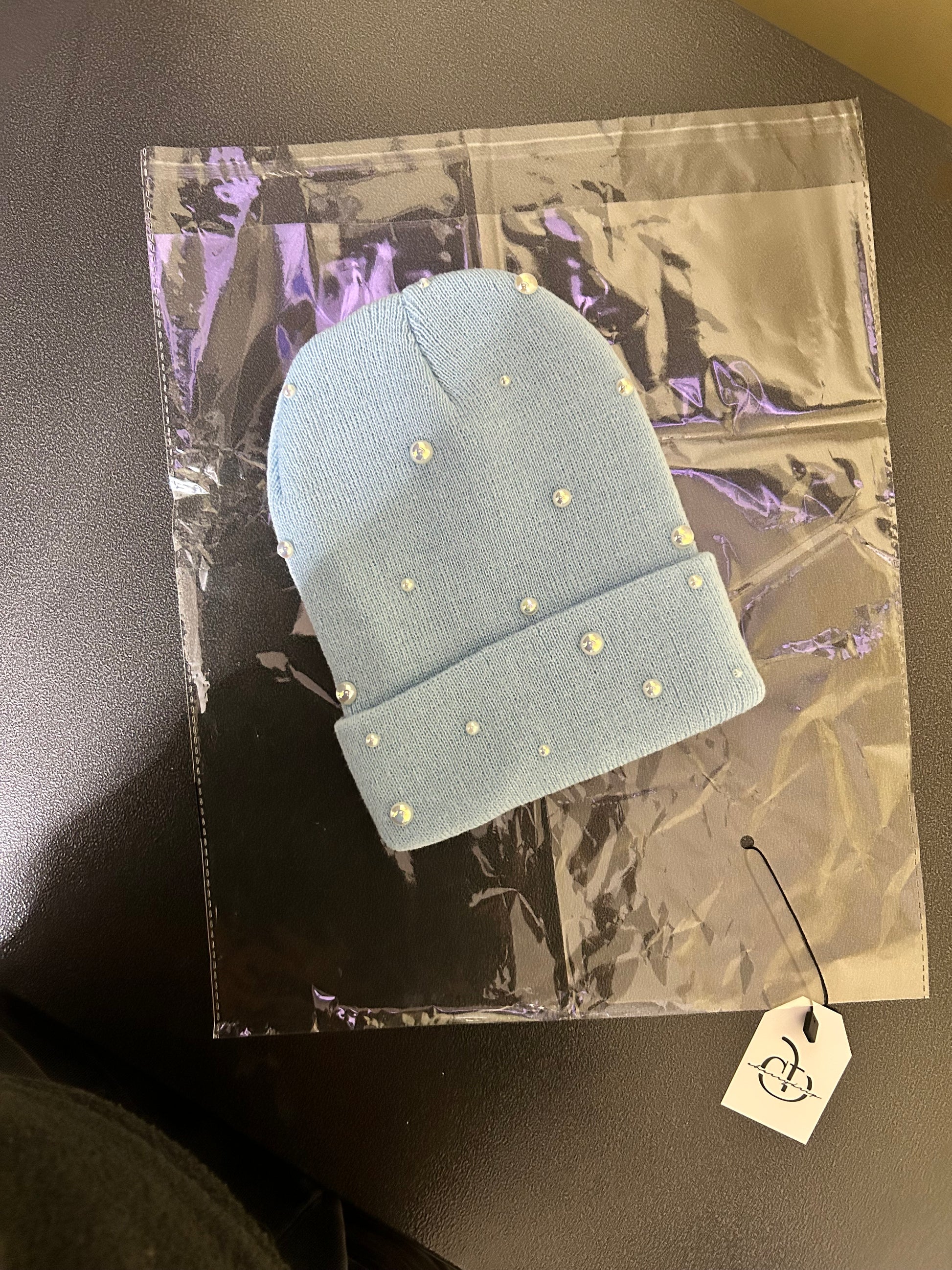 Let your style flow with Pearl Me a River — a soft light-blue beanie designed with elegance and ease in mind. Adorned with beige AB pearl accents, this piece catches the light beautifully, creating a gentle shimmer that elevates any outfit.