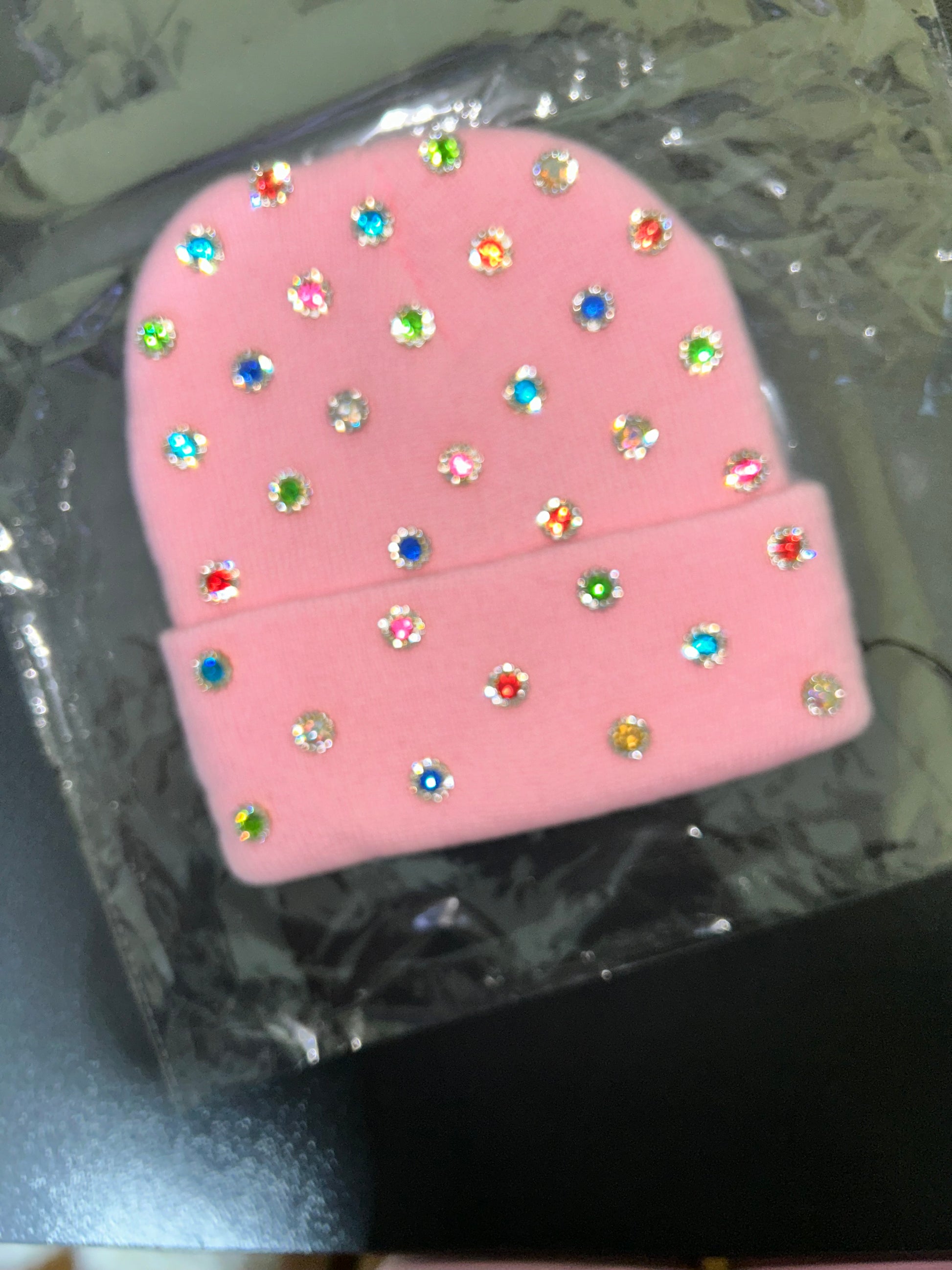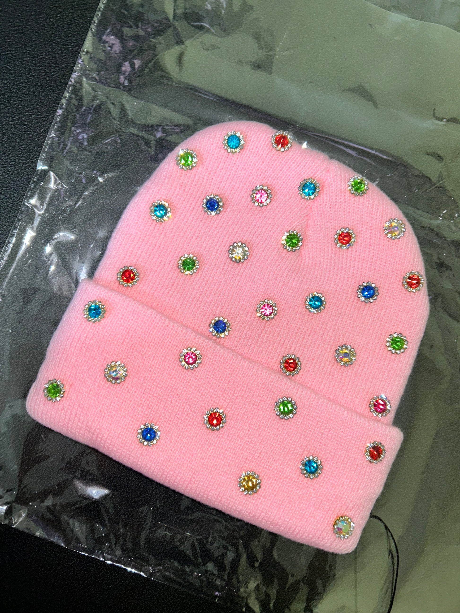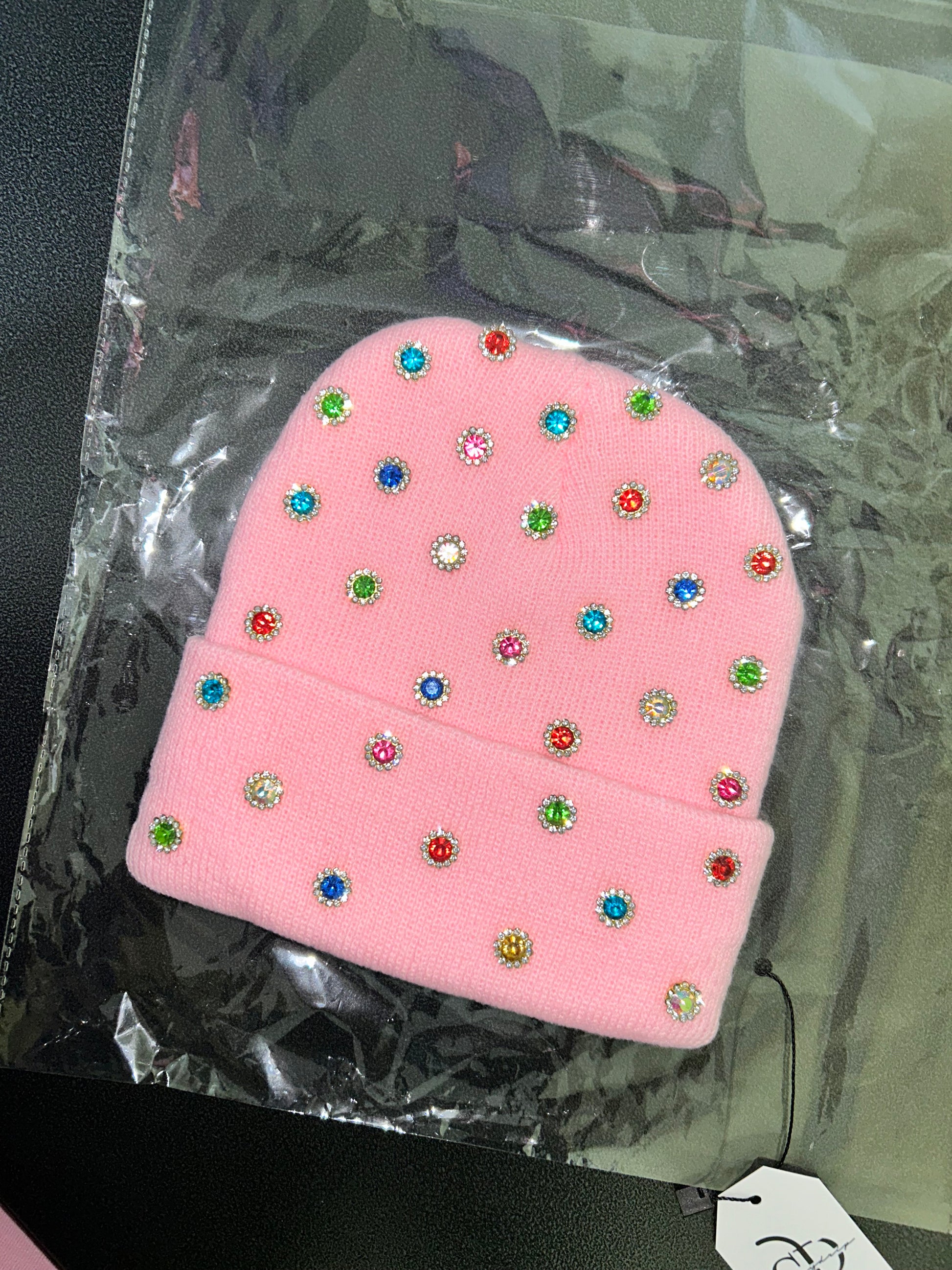 Designed on a soft pink beanie and finished with multicolor rhinestones, this piece captures playful luxury with bold personality. The scattered sparkle creates a “storm” of color that shines effortlessly, making every outfit feel intentional.
