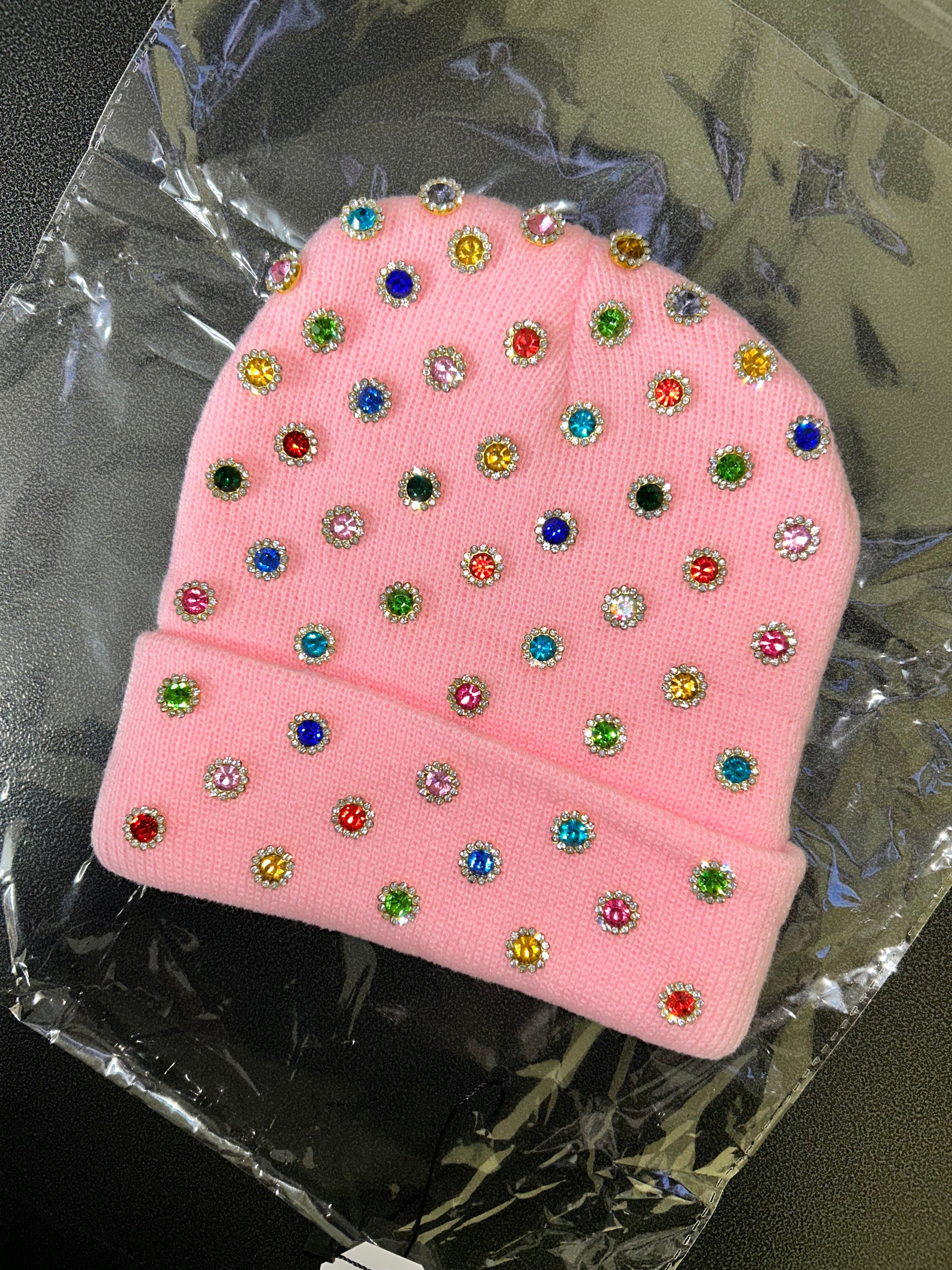 Step into the spotlight with Pink Gem Parade — a soft pink statement beanie adorned with vibrant multicolor jeweled rhinestones, each framed in luxe gold detail.