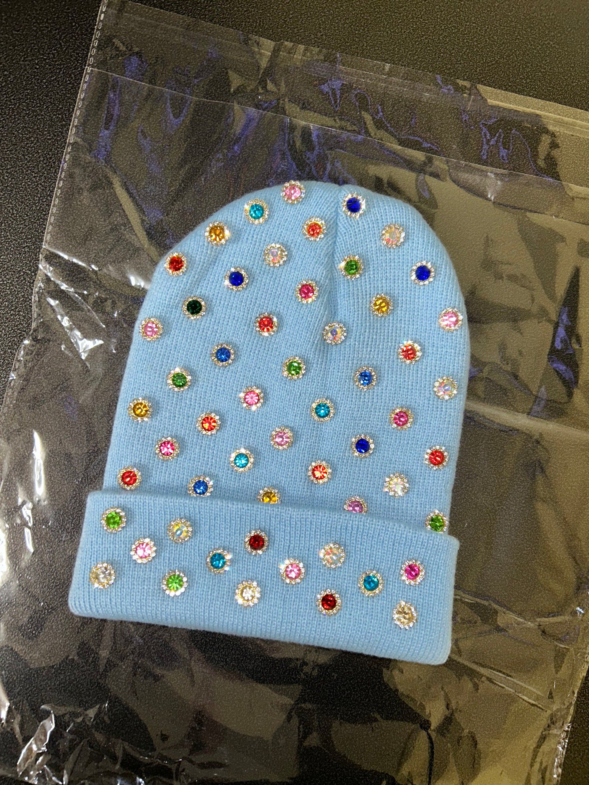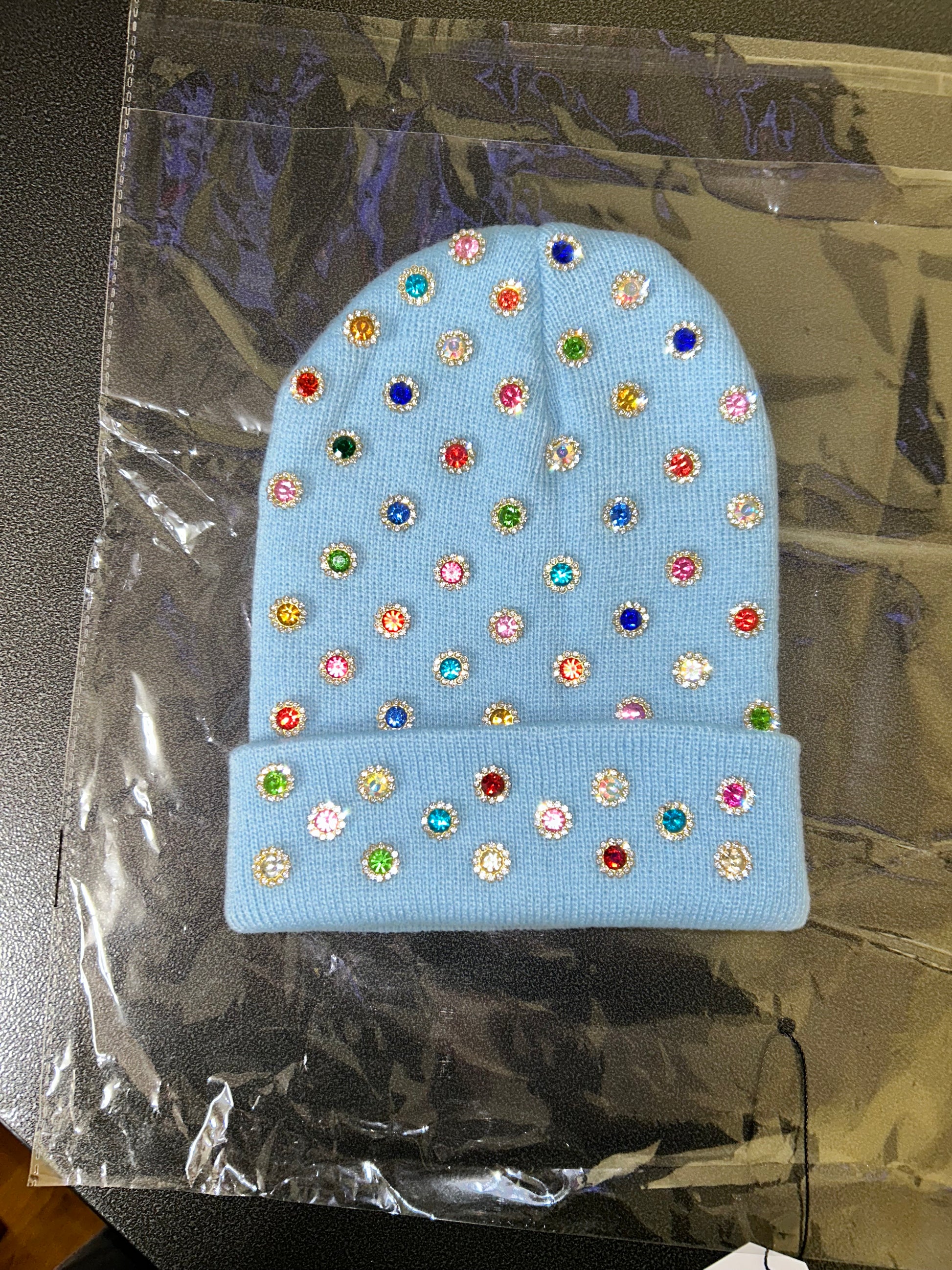 Make noise without saying a word in Sky Candy Riot — a soft light blue beanie covered in vibrant multicolor jeweled rhinestones, each framed in luxe gold detail.