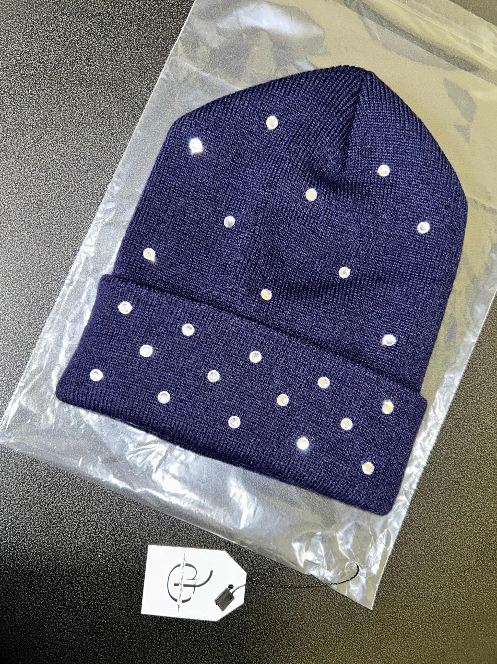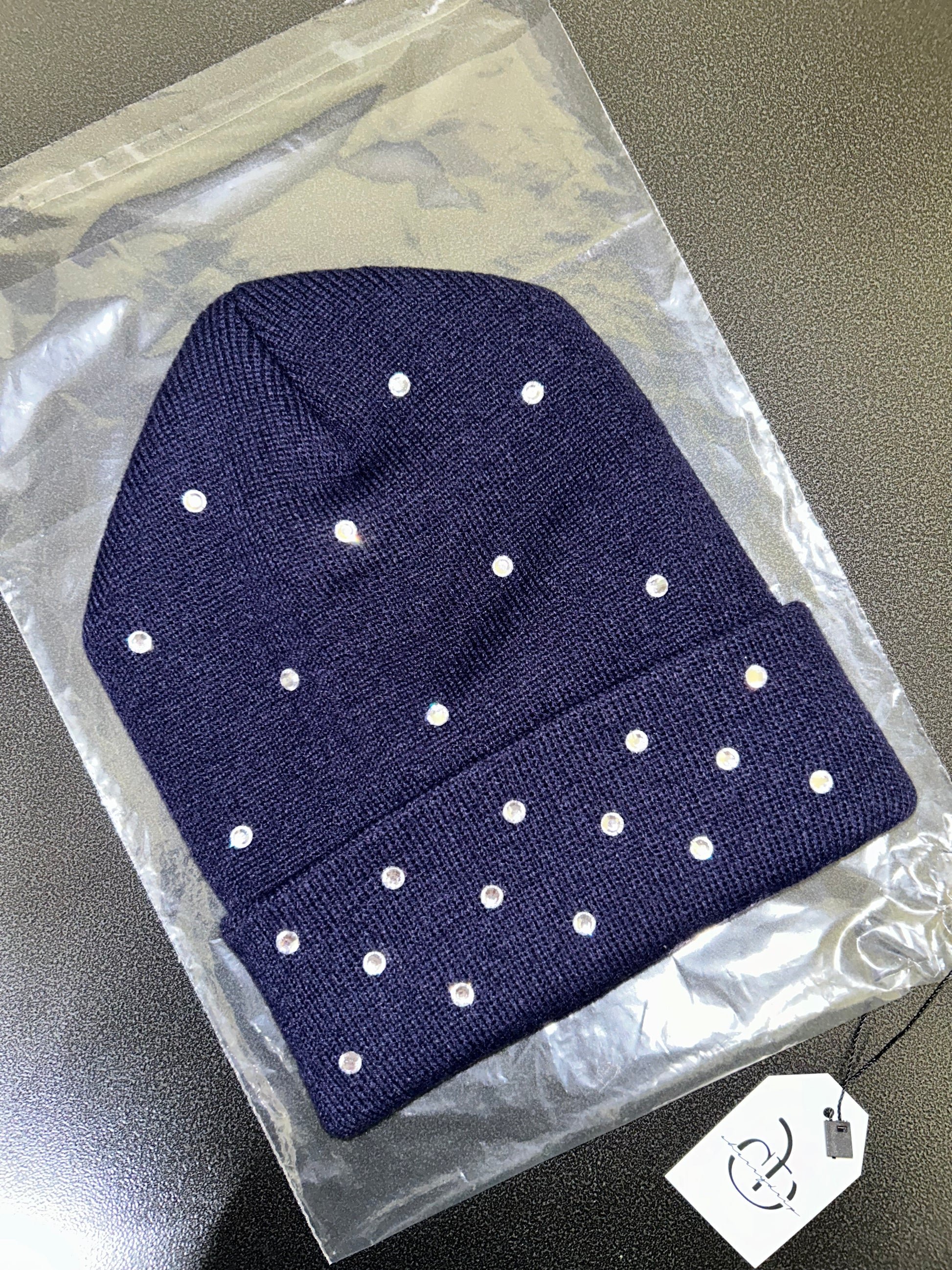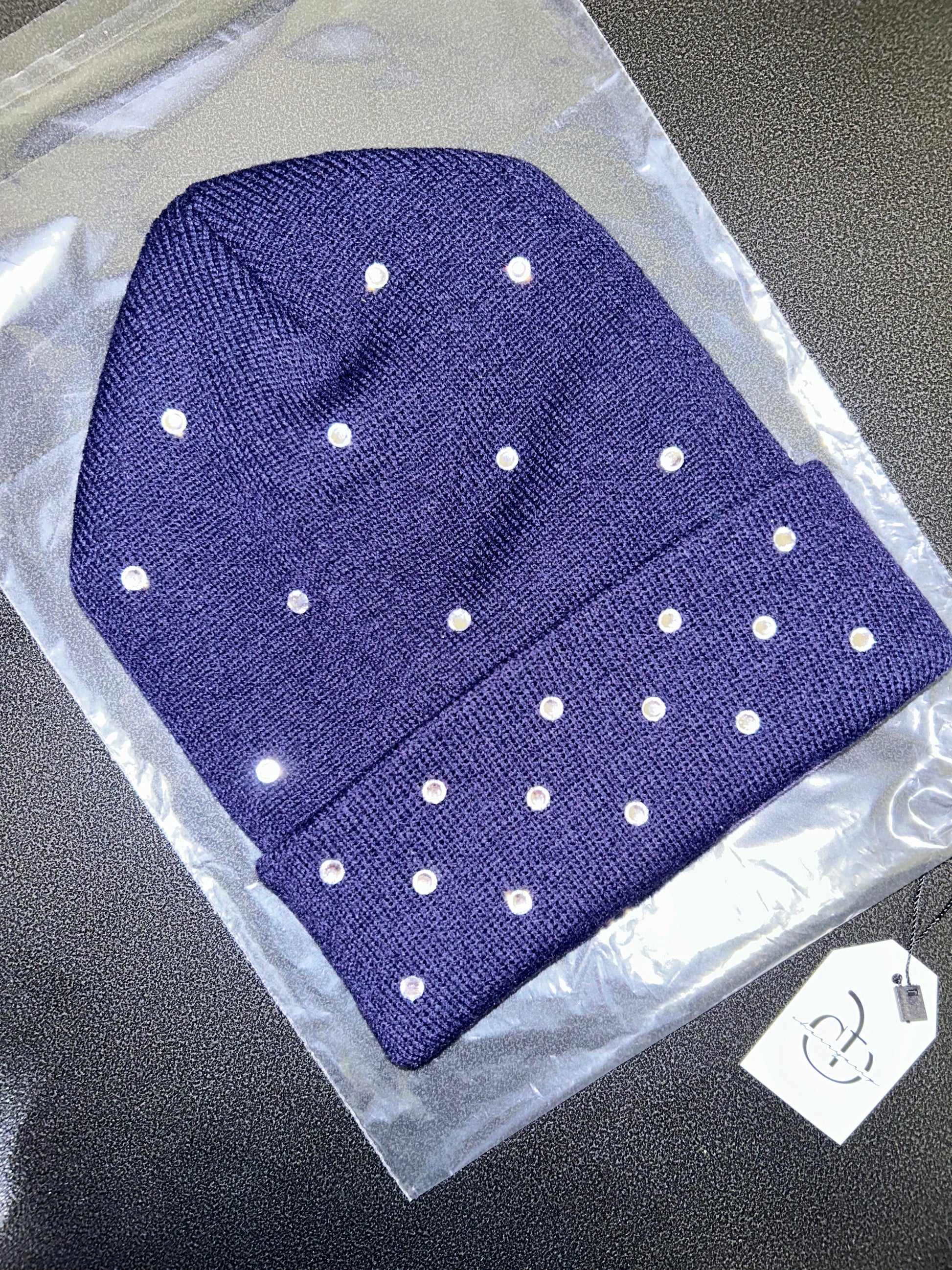 Midnight Ice captures the stillness of night with a frozen glow. Crafted on a deep navy knit and finished with clear rhinestones, this beanie delivers understated shine with a cool, confident edge.