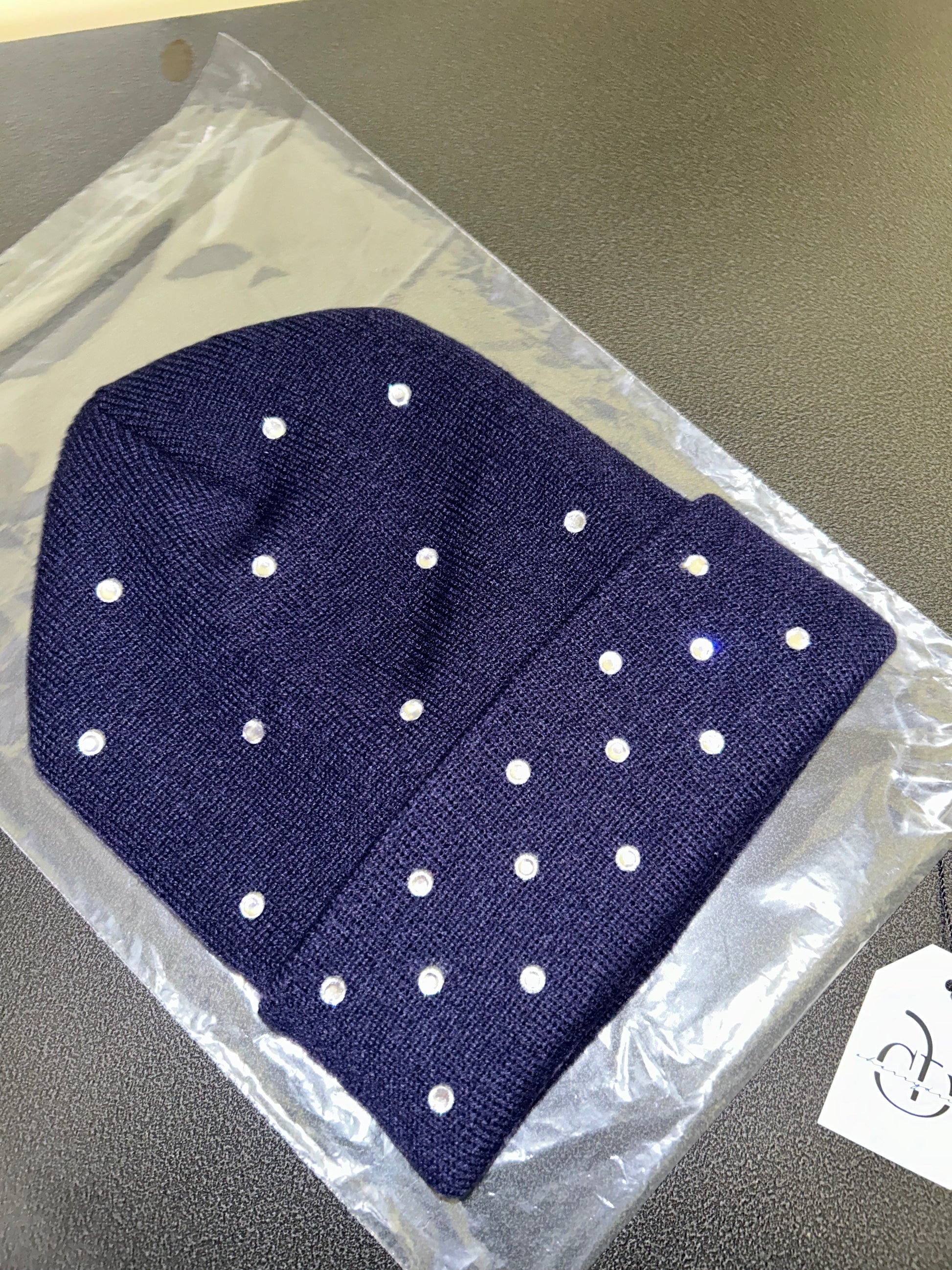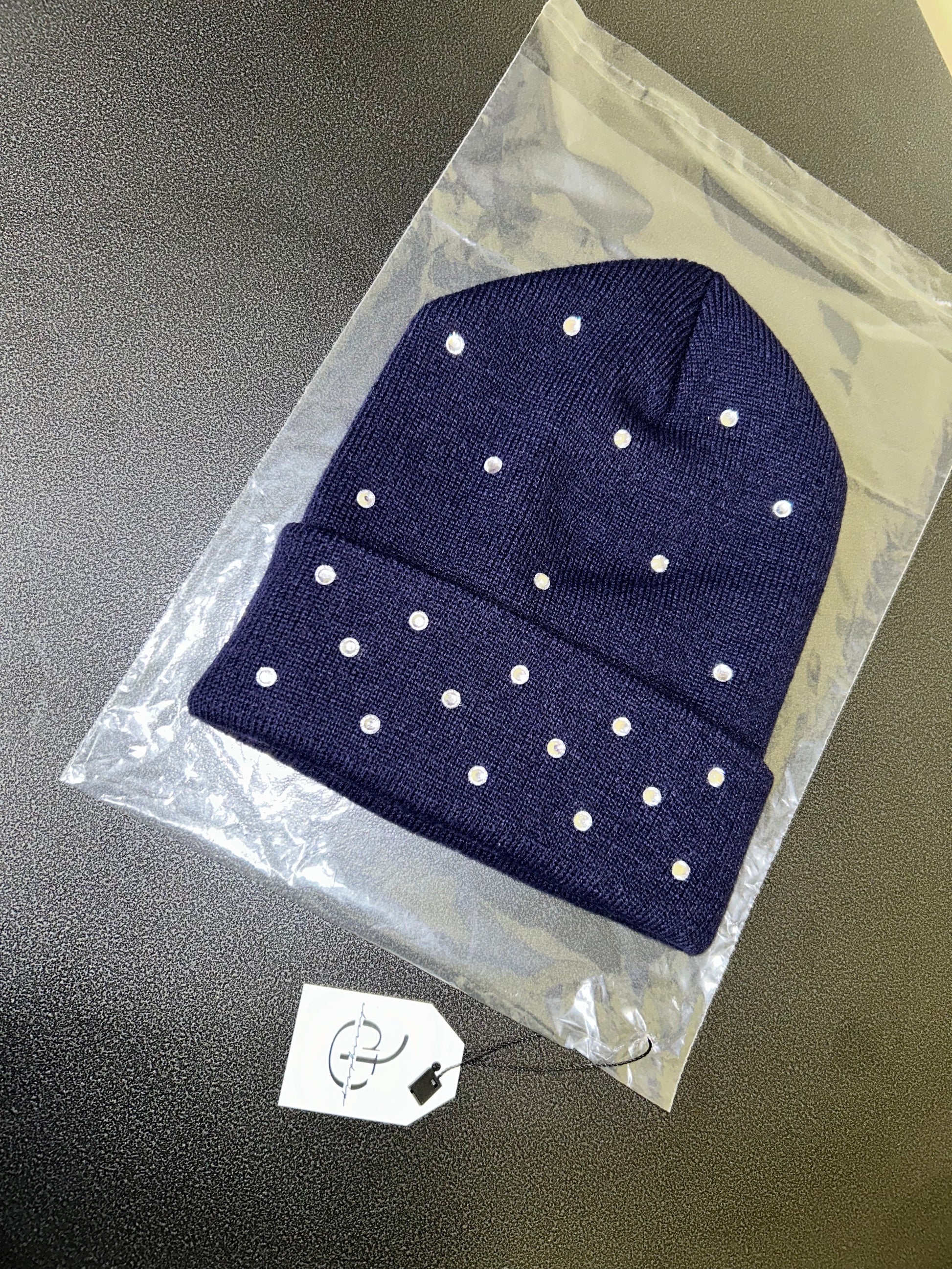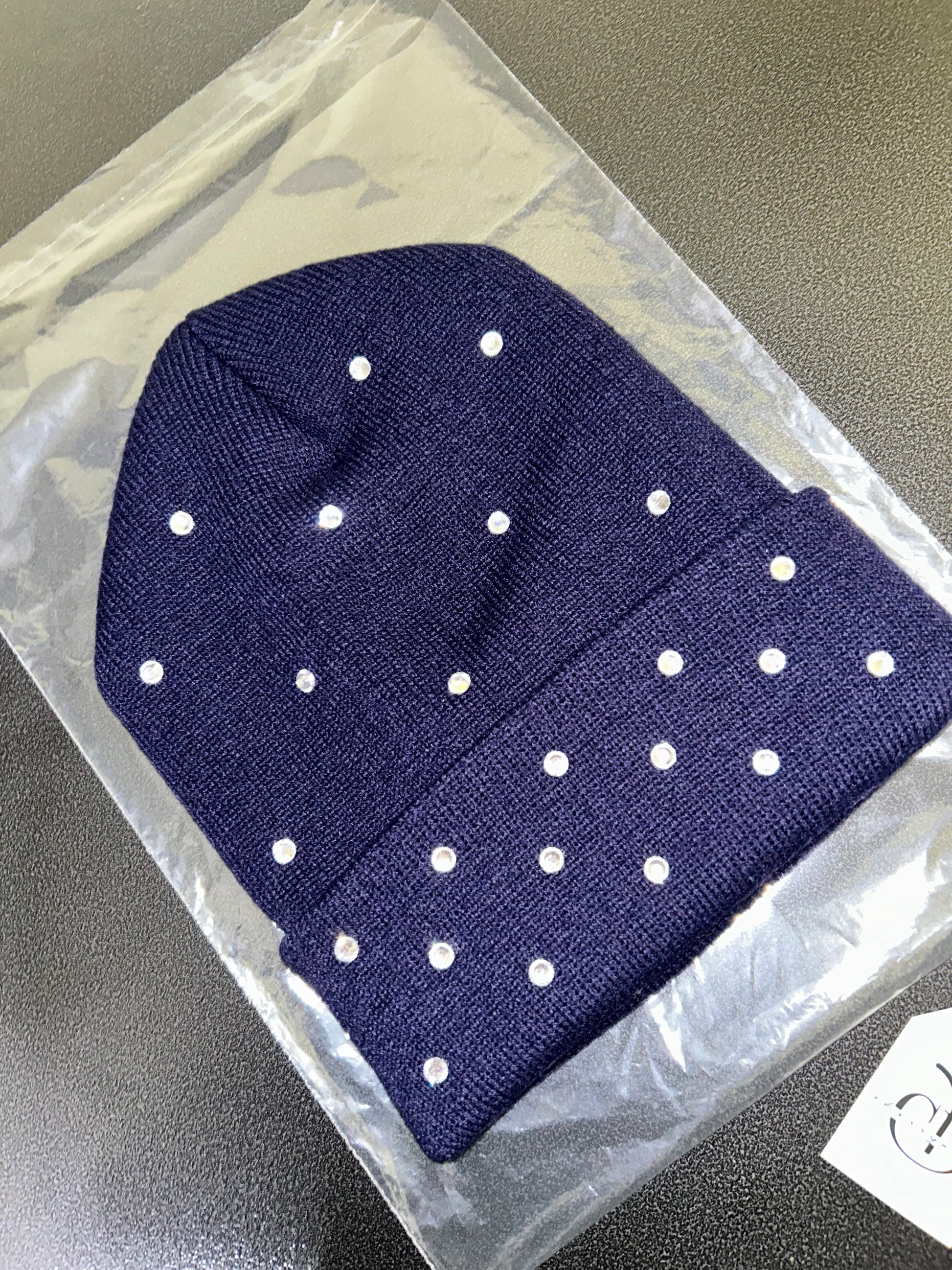 Midnight Ice captures the stillness of night with a frozen glow. Crafted on a deep navy knit and finished with clear rhinestones, this beanie delivers understated shine with a cool, confident edge.
